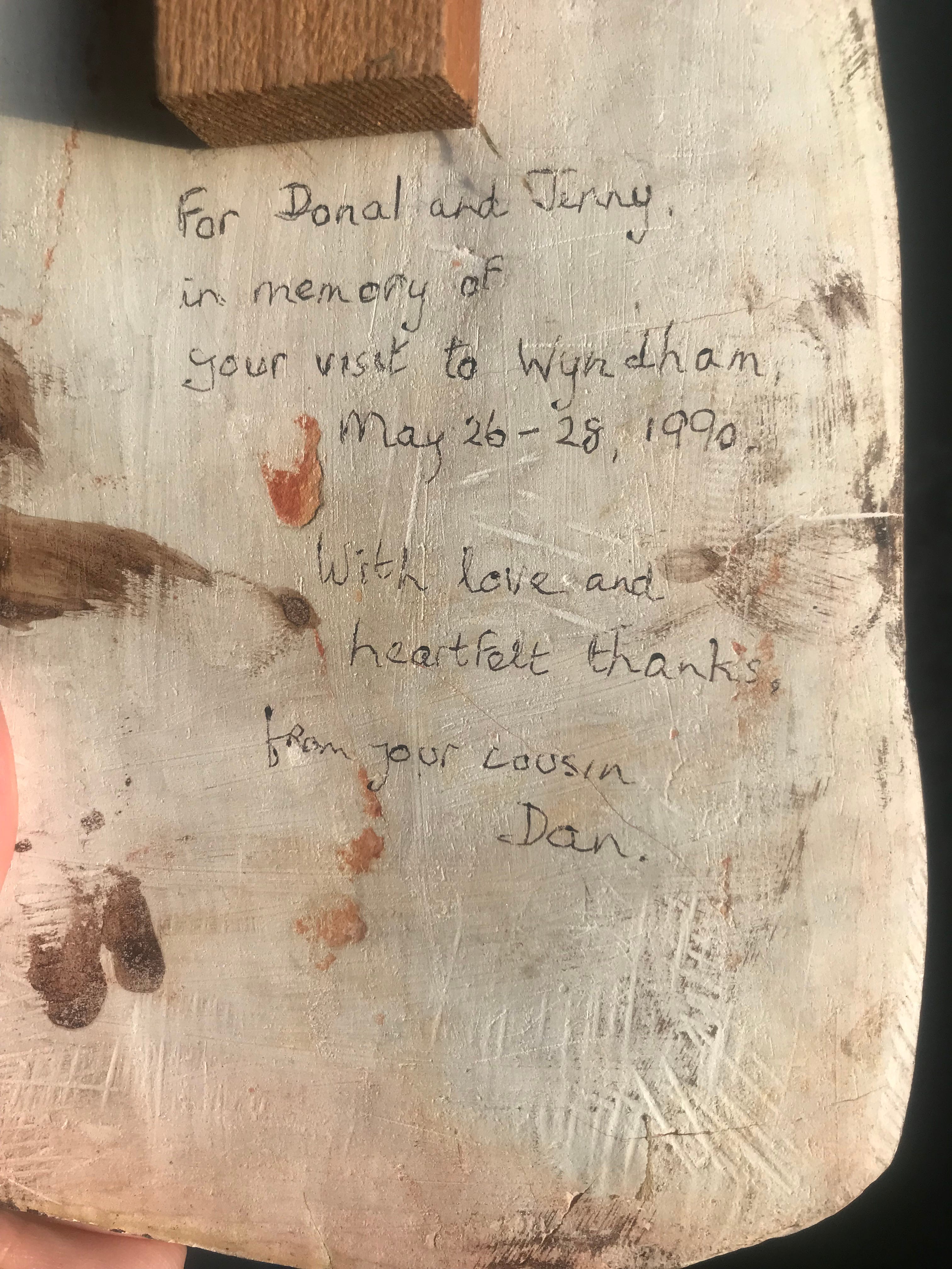 I’m pretty sure that Dan was living in Fitzroy Crossing or Wyndham in Kimberley, WA, when my parents came to see him in 1990, to get married for a second time. He gave them this carved piece in memory: