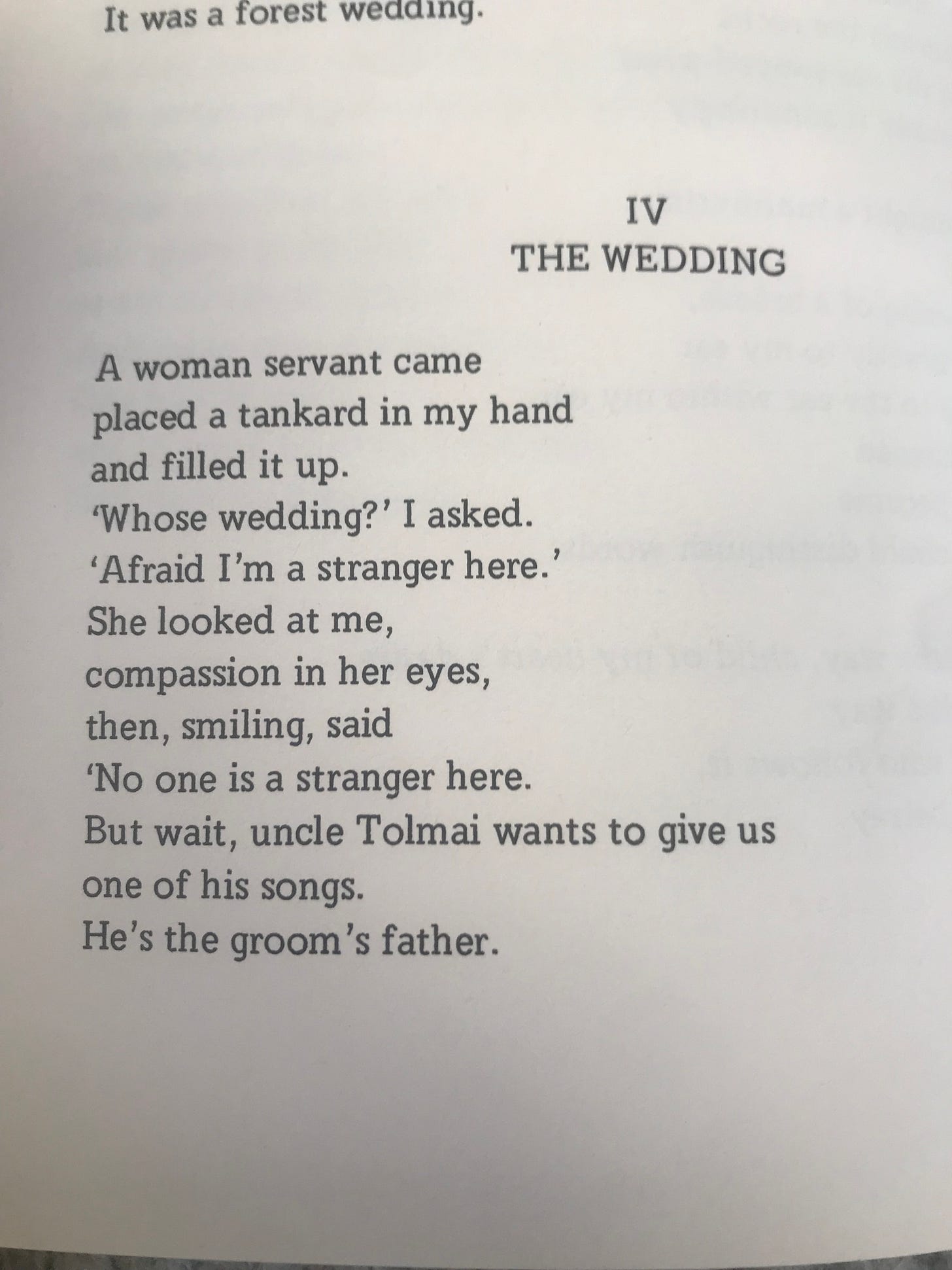 “Richard Lee calculated that a Bushman child will be carried a distance of 4,900 miles before he begins to walk on his own. Since, during this rhythmic phase, he will be forever naming the contents of his territory, it is impossible he will not become a poet.”