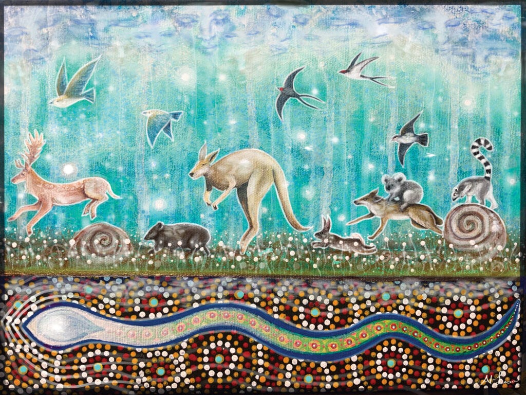 I think of the Dreamtime that Dan embraced. Across the landmass of Australia is the Rainbow Serpent, associated with rain and water, fertility and food, and with the prosperity of a community, found in rock art there from 6000 years ago and further back in time. The all-powerful rainbow serpent travelled across the flat land in search of his own people. As he travelled from the south to the north of the country, he made formations in the land. I think of my own ancestors, and their migrations. And Dan’s.