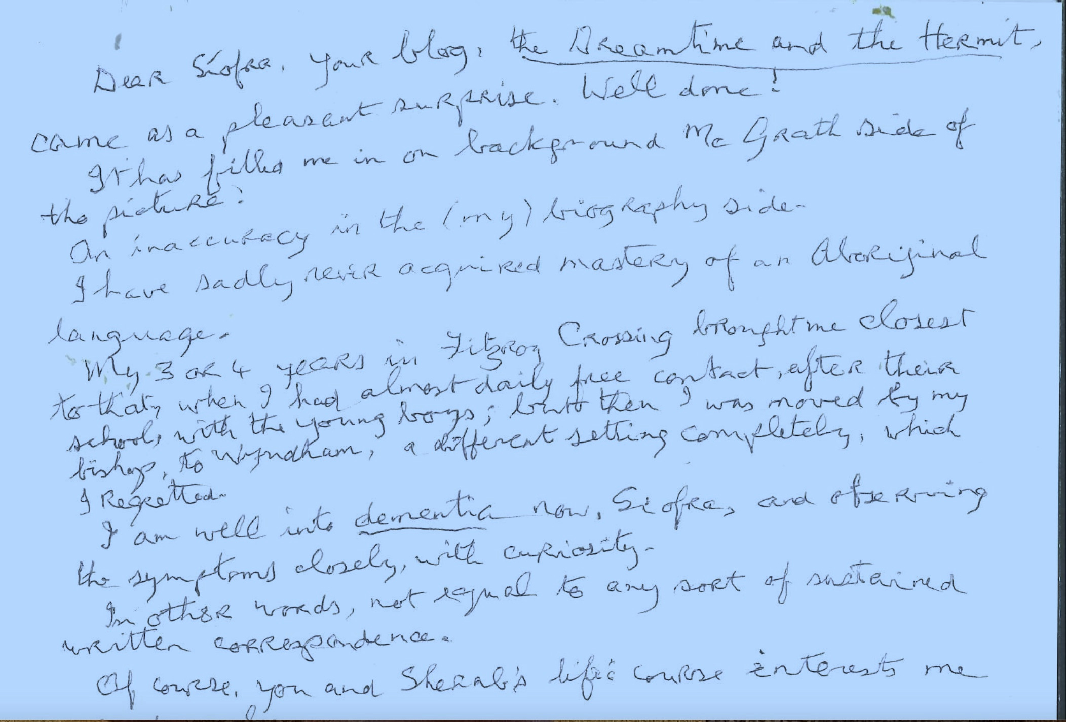 “I knew him well. He was the priest in Fitzroy Crossing. Everybody knew him. He’s the priest in Bruce Chatwins’ book Songlines, who lived in a hut.”
